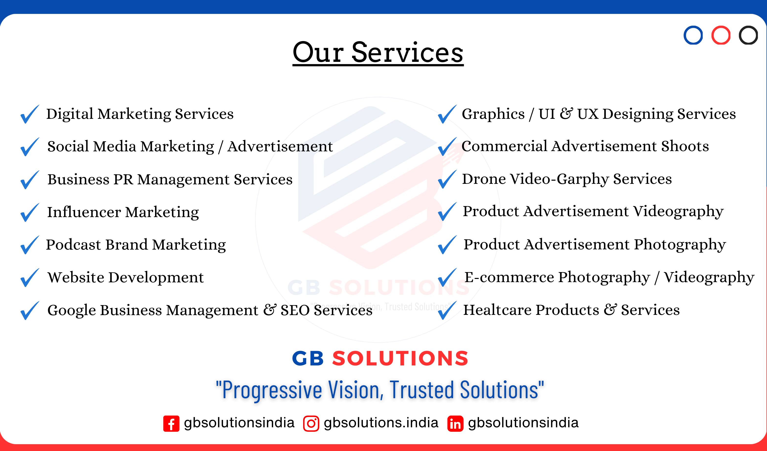 At GB Solutions, we provide innovative digital marketing, branding, PR management, and IT solutions to help businesses grow and succeed. Our expert strategies enhance visibility, engagement, and revenue, ensuring a strong market presence. Partner with us for smart, result-driven solutions!